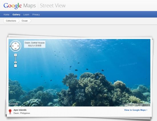 凱特琳海景調(diào)查組織的幾名成員使用特殊的攝影機潛入海底拍攝了全景照片,然后將其整合到谷歌地圖中,以類似于“街景”服務(wù)的模式為用戶提供服務(wù),使之不必親自潛水也可以欣賞海底美景。
