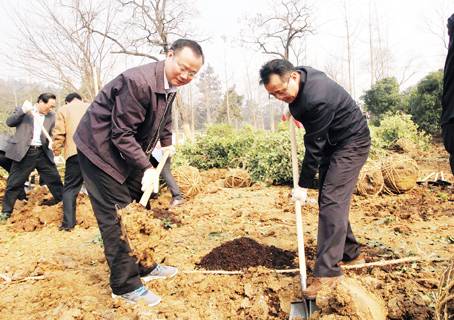 上午10時許,一到植樹現(xiàn)場,周春雨、白金明、何金良、顧世平、方志宏等市幾大班子領(lǐng)導(dǎo)就迅速融入到植樹勞動的大軍之中。他們興致勃勃地拿起鐵鍬,同在場的干部一起揮鍬挖土,將一棵棵樹苗植入樹坑,培土,澆灌,每道工序都做得十分認(rèn)真。市委書記周春雨、市長白金明一邊植樹,一邊與市林業(yè)局、住建委負(fù)責(zé)同志交談,了解全市植樹造林及“綠滿珠城”工作開展情況。經(jīng)過一番緊張勞動,300多棵桂花、櫻花等樹木昂然挺立,在和煦的春光中綻放蓬勃生機(jī)。
