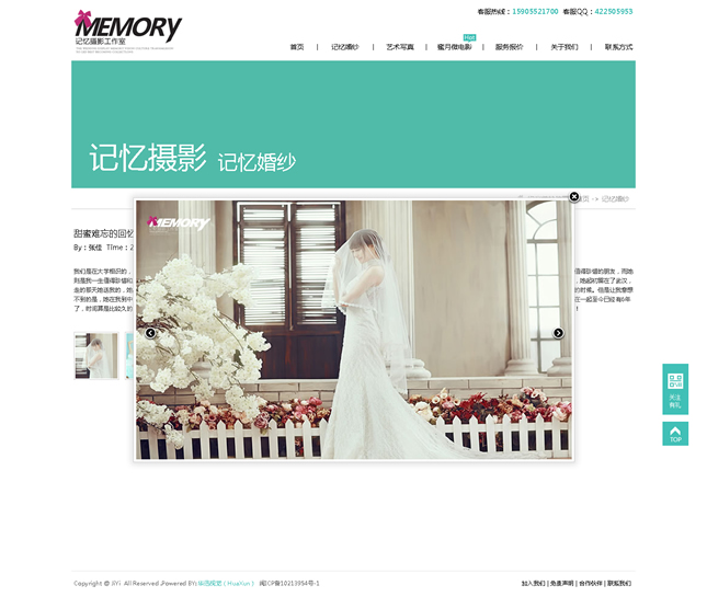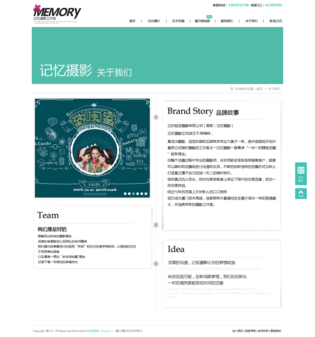 記憶視覺攝影有限公司(簡稱:記憶攝影)記憶攝影正式成立于2008年,集頂尖攝影、造型妝容和后期特效專業(yè)力量于一體,是中國首批開創(chuàng)外景旅行式婚紗攝影的工作室之一記憶攝影一直秉承“一對(duì)一的精致拍攝”服務(wù)理念。在整個(gè)拍攝過程中專業(yè)的攝影師、化妝師都會(huì)至始至終跟隨客戶,顧客可以隨時(shí)和拍攝組進(jìn)行溝通和交流,不斷的創(chuàng)新獨(dú)特的拍攝方式為新人打造真正屬于自己的獨(dú)一無二的婚紗照片。做到真正的人性化,同時(shí)在更多程度上保證了照片的完美質(zhì)量,附加一份完美體驗(yàn)。